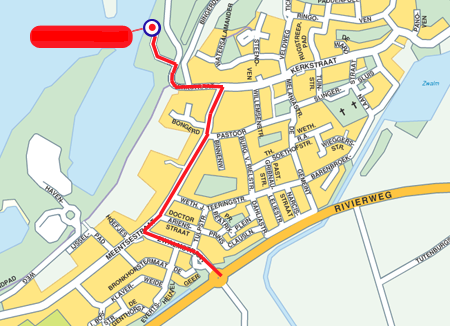 Vlak na de bocht op de Rhedenseveerweg, zie aan de linkerkant de wijk “Giese Pan” liggen. Sla hier links af, en rij door tot nummer 61 op het einde.